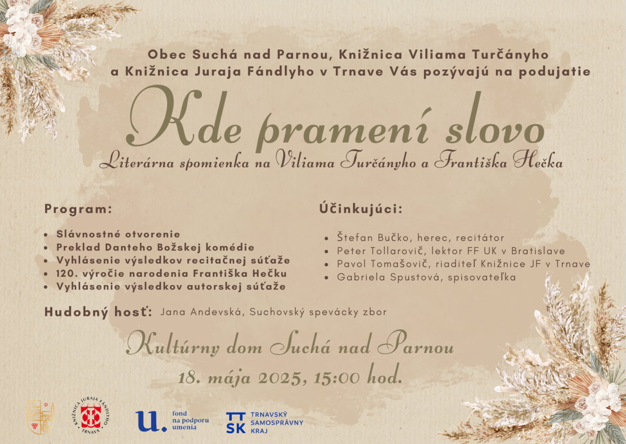 Výhercovia zarecitujú diela na literárnom poobedí Kde pramení slovo, ktoré sa uskutoční v nedeľu - 18.5.2025 o 15:00 hod. Srdečne pozývame aj širokú verejnosť.